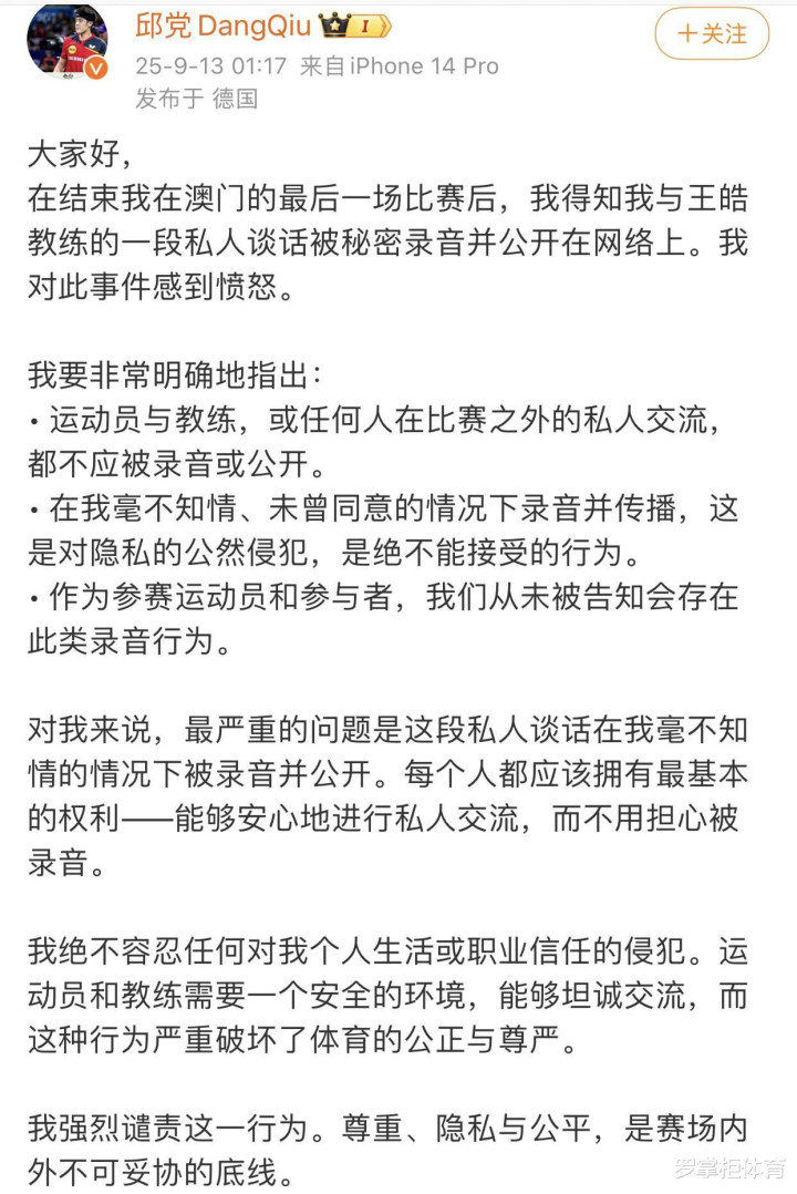 日前,德国华侨乒乓球领略员邱党在个东说念主外交平台针对其与国乒男队主熏陶王皓暗里聊天骨子被灌音且公开一事发声,激发网友热议。从骨子来看,邱党利害谴责与王皓的对话被灌音,并对聊天骨子被公开一事感到震怒。邱党的这一作念法很快得回了弘大网友的恢复,但内行的不雅点和态度却存在不同。有东说念主复古邱党维权到底,也有球迷以为关联聊天骨子是被场边确立收音,邱党需与WTT赛事阁下方、平台方疏导。