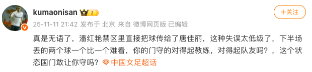 赛后有名媒体东谈主“kumaonisan”就狠批潘红艳:“真的疾苦了,这种装假太初级了,下半场丢的两个球一个比一个出丑,你的门守的对得起讲明,对得起队友吗?,这个现象国门敢让你守吗?”