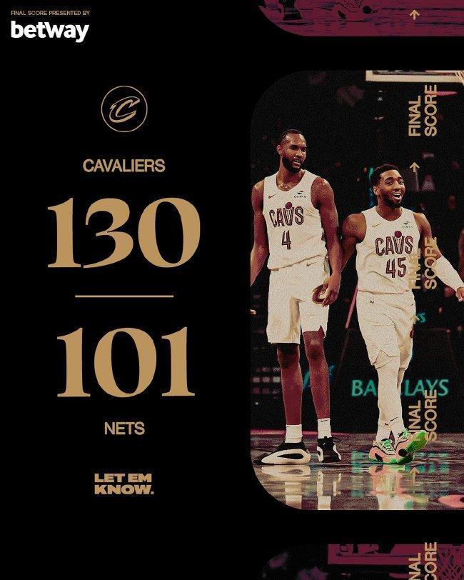 骑士(23-4):小莫布利21分5篮板、勒韦尔19分4助攻、米切尔18分3篮板5助攻4抢断、尼昂17分9篮板、奥科罗12分、阿伦12分8篮板4助攻、加兰11分6助攻