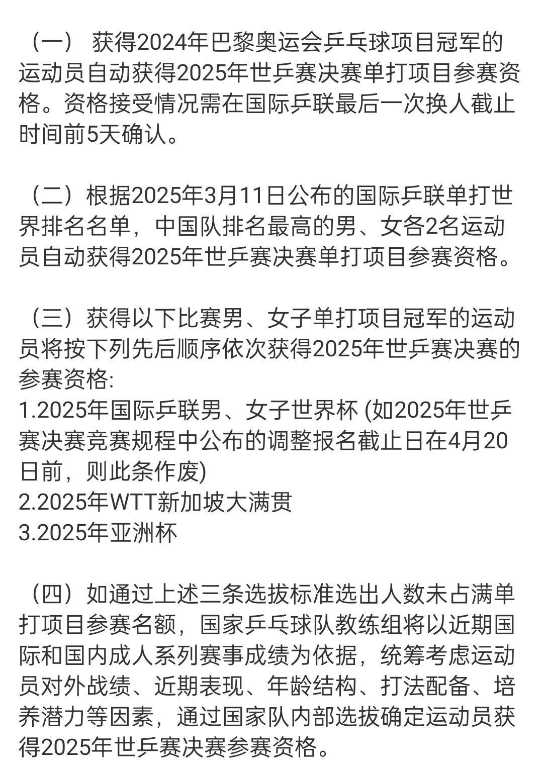 第二条端正也很肤浅,那即是笔据宇宙排行来选东说念主。3月11日公布的宇宙排行中,排行前二球员拿到限额。从当今的宇宙排行来看,王楚钦、林诗栋排行男单前二,孙颖莎、王曼昱排行女单前二。王楚钦、孙颖莎、王曼昱三东说念主还是拿到了纵贯的限额,剩下就看林诗栋的阐扬。如若林诗栋届时冒失稳住第二的位置,或者是冲到第一,那他就能锁定一张门票。