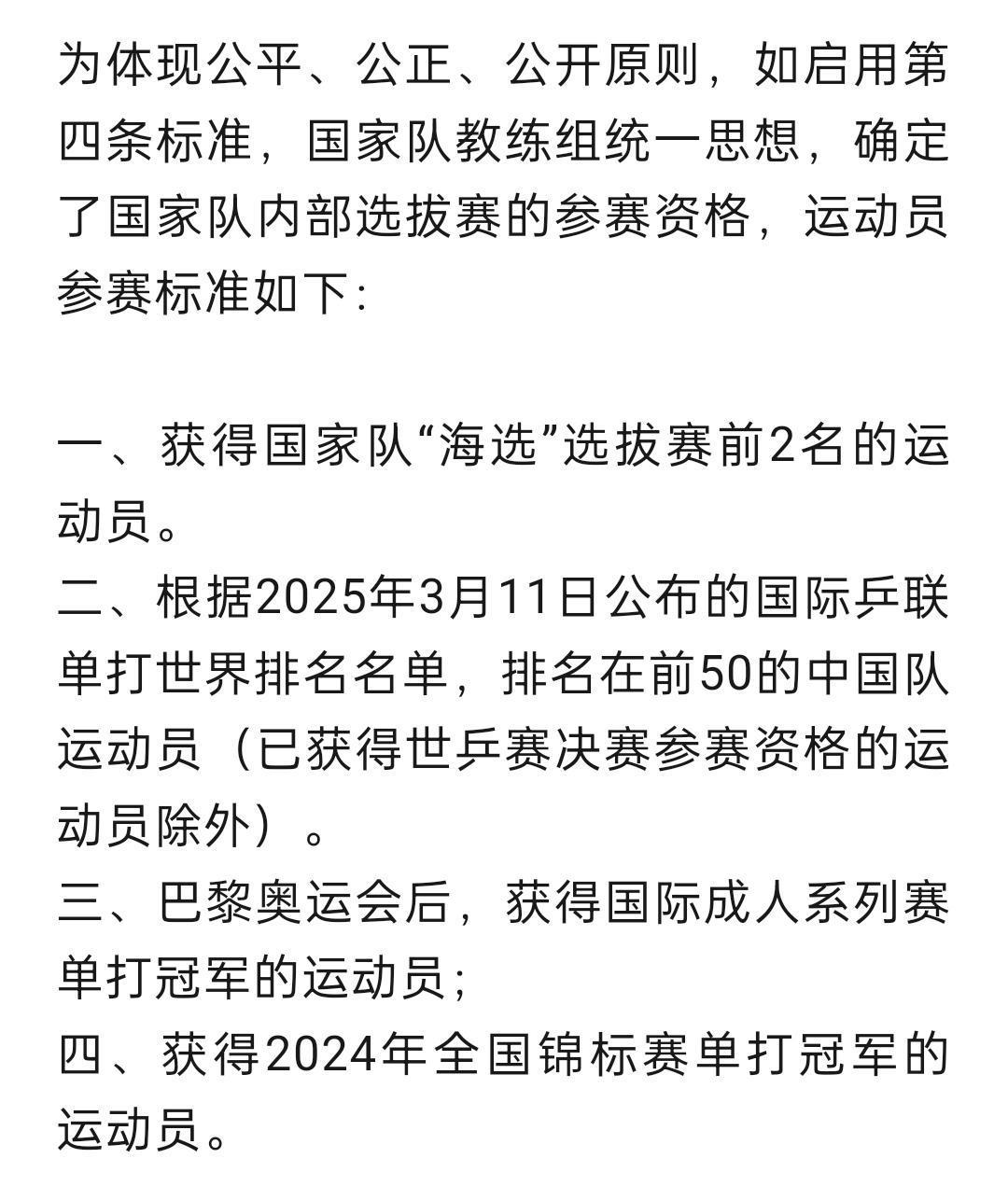 遴荐决议整个有四条,每一条齐很赫然,中枢球员,主力球员在遴荐上有一定的上风。年青小将契机均等,日常证明是要道,必须要平安阐扬,打出过硬证明,这才智获得国乒的信任。